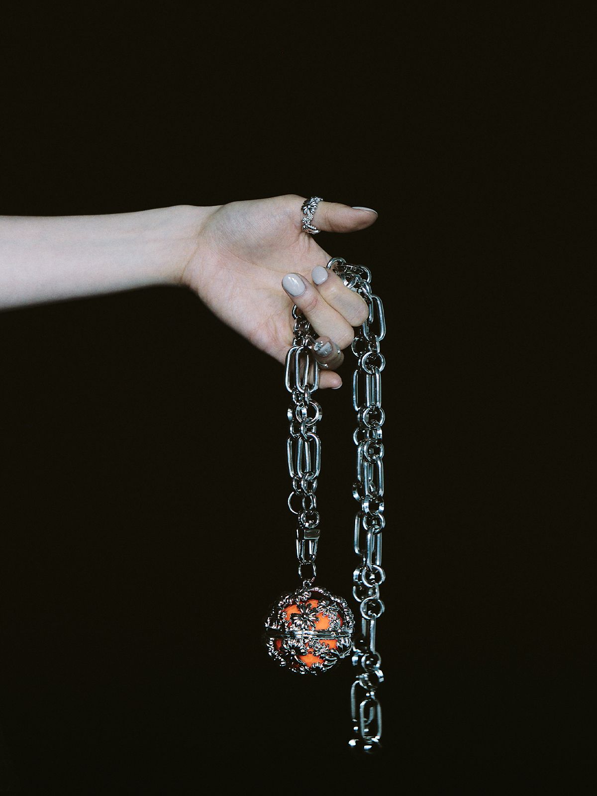 A long chain strap with carabiner detail makes it easy to wear as a crossbody or clip on as a charm.