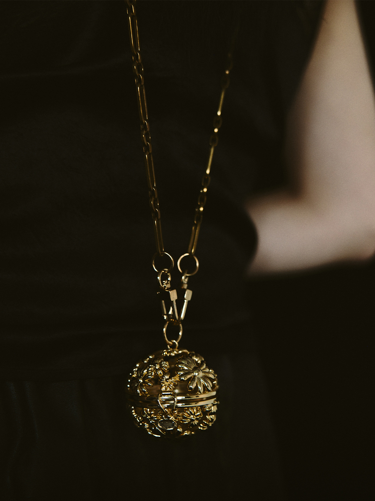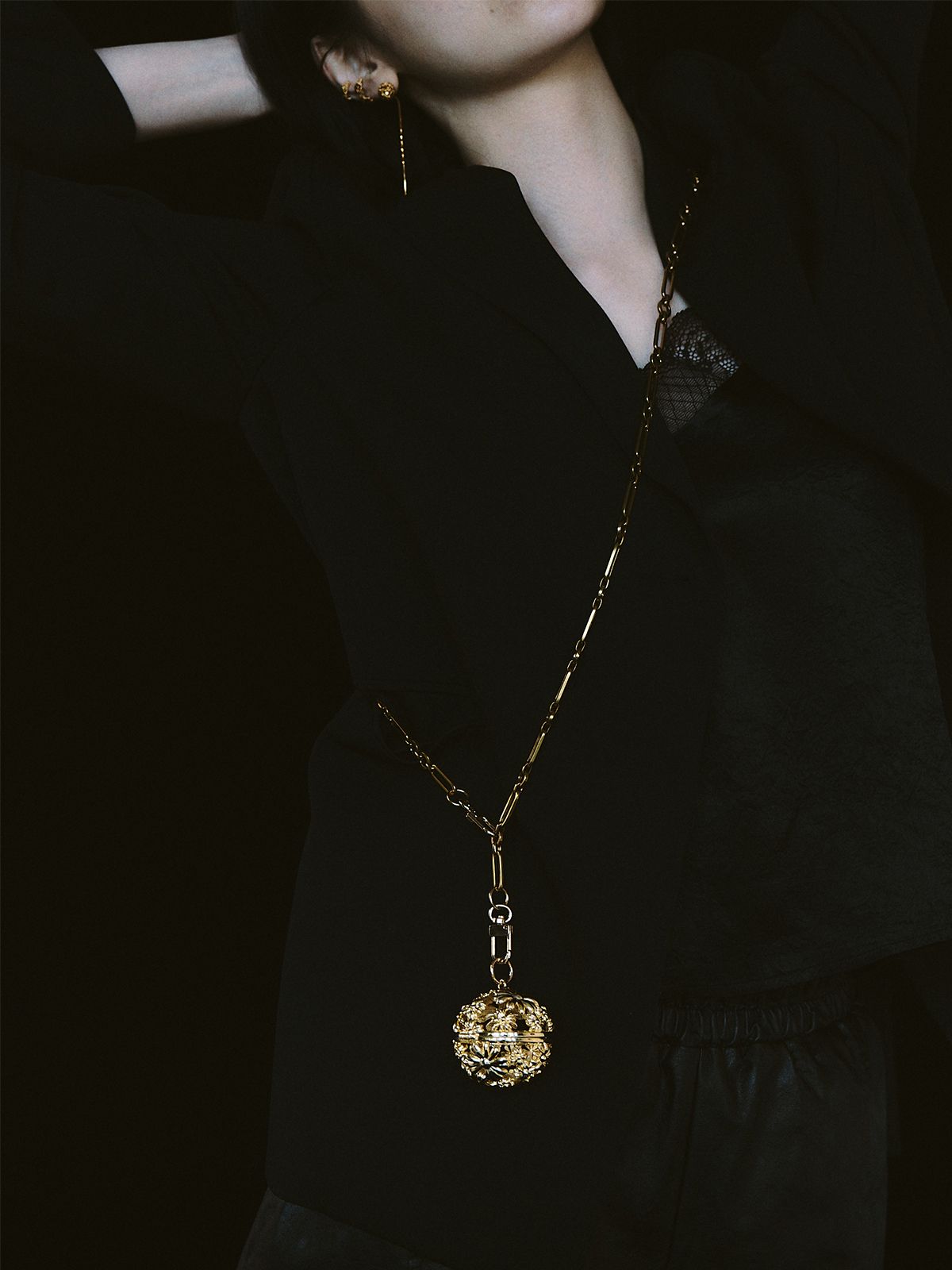 A nano bag with a spherical form woven in fine Daisy motif, adding a small, accessory-like volume to the look.