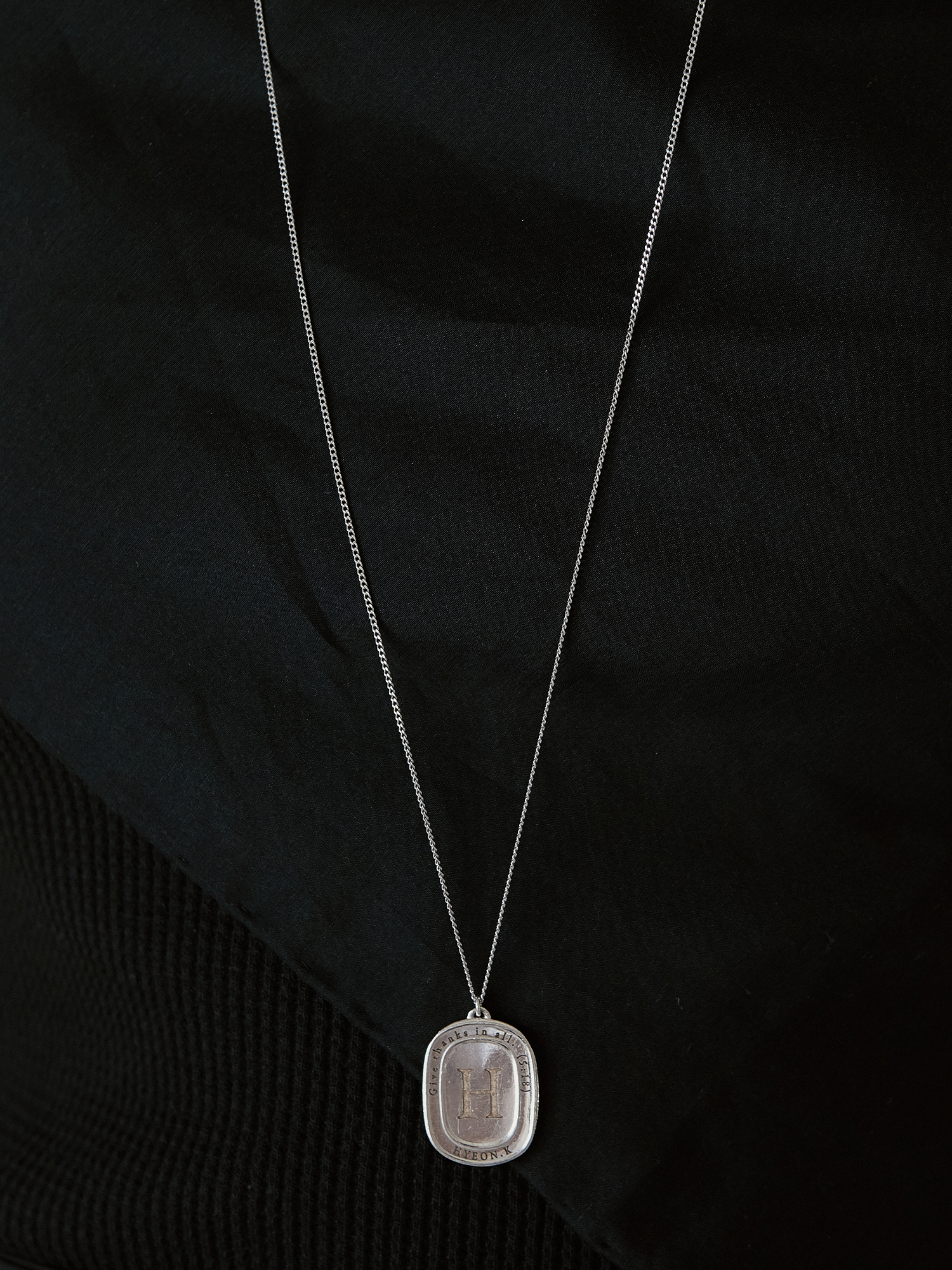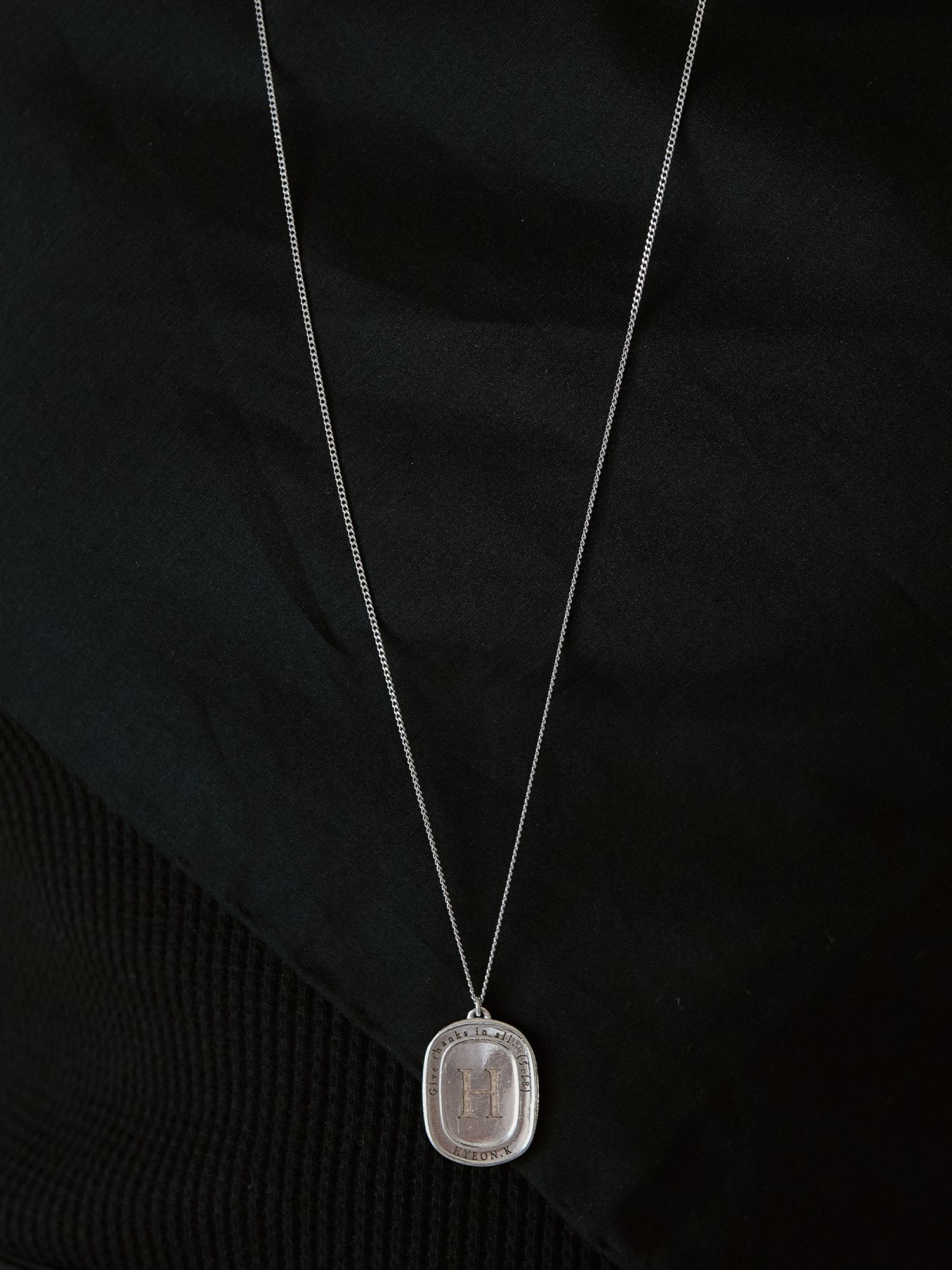 INITIAL LINE의 목걸이디자인입니다. (미아 방지 및 강아지인식 목걸이로도 가능합니다.) 얇은기본 체인으로 길게 착용 가능하며, 목걸이 길이 수정은 가능합니다. 팬던트에는 원하는 문구를 각인 가능합니다.