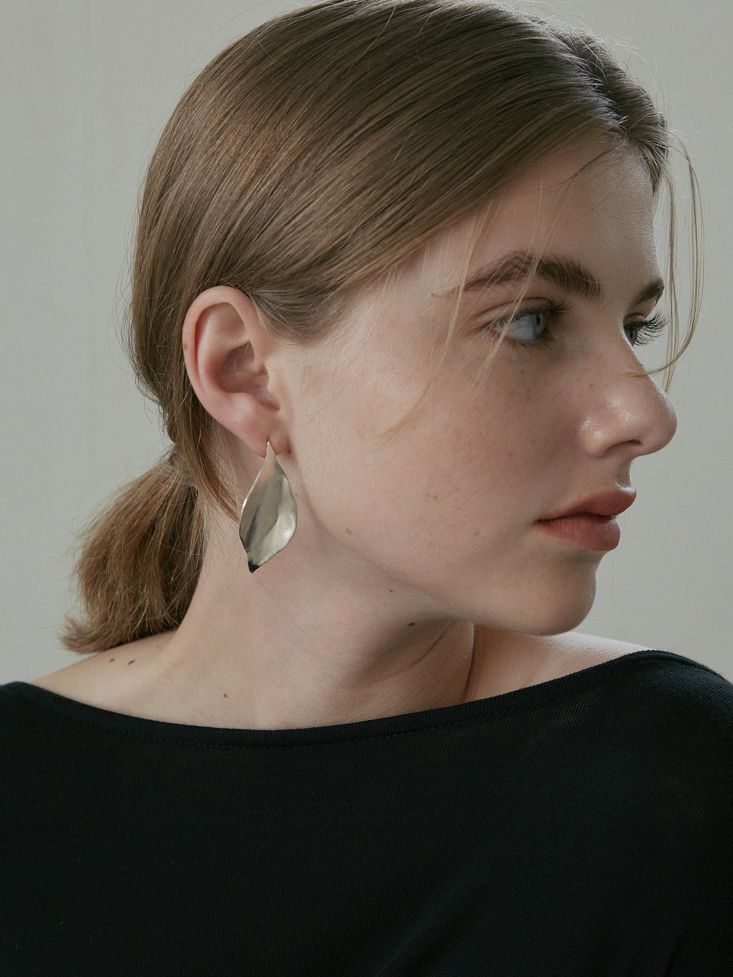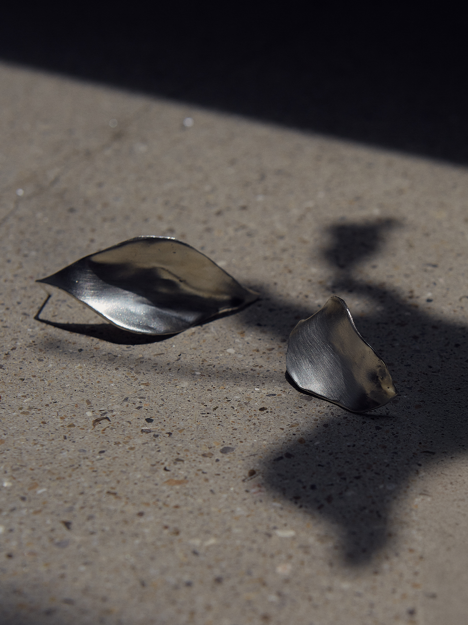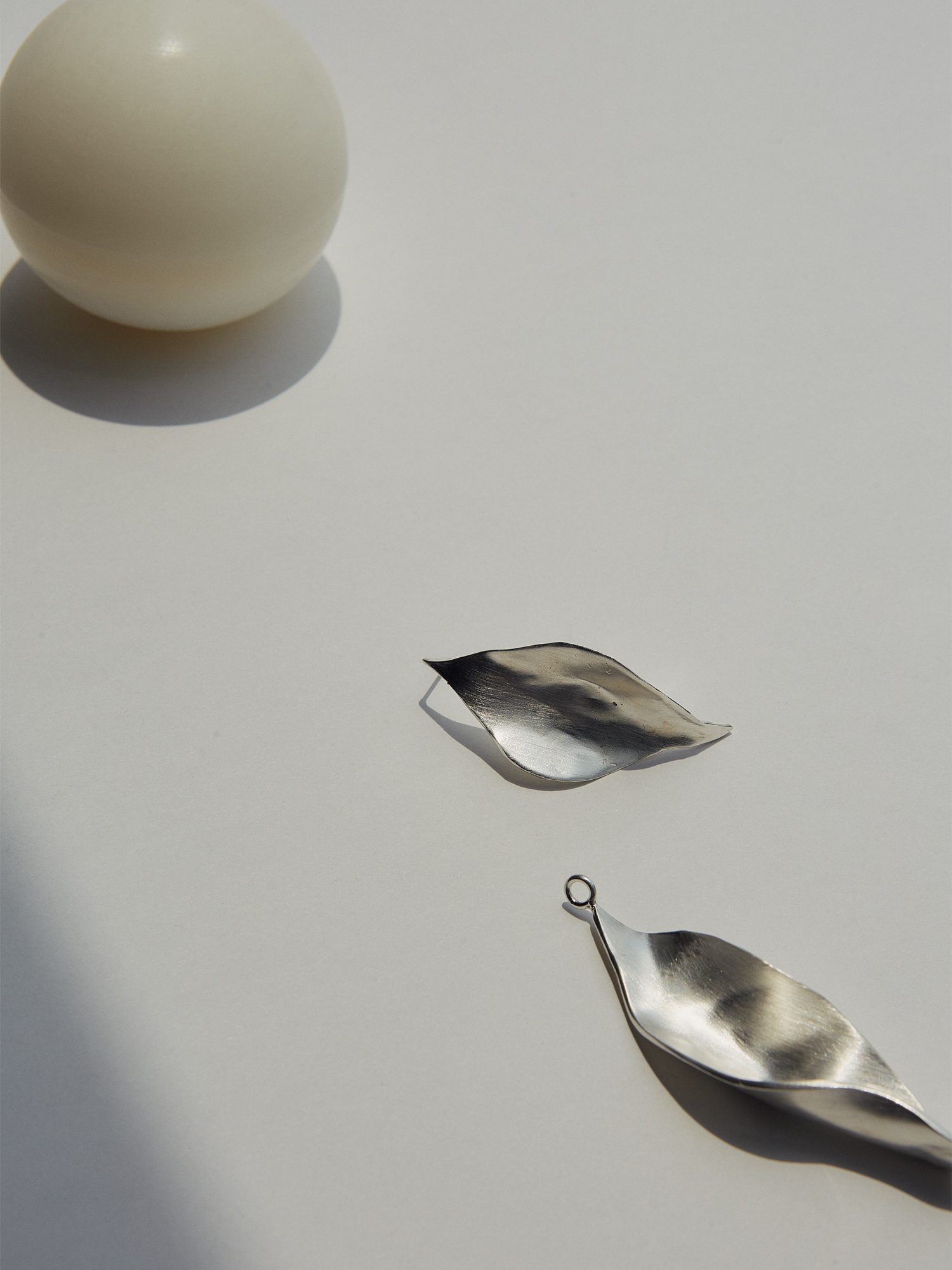 나뭇가지 모양으로 만든 링 귀걸이입니다. 잎과 가지의 모양과 텍스처를 금속에 작업하였습니다.