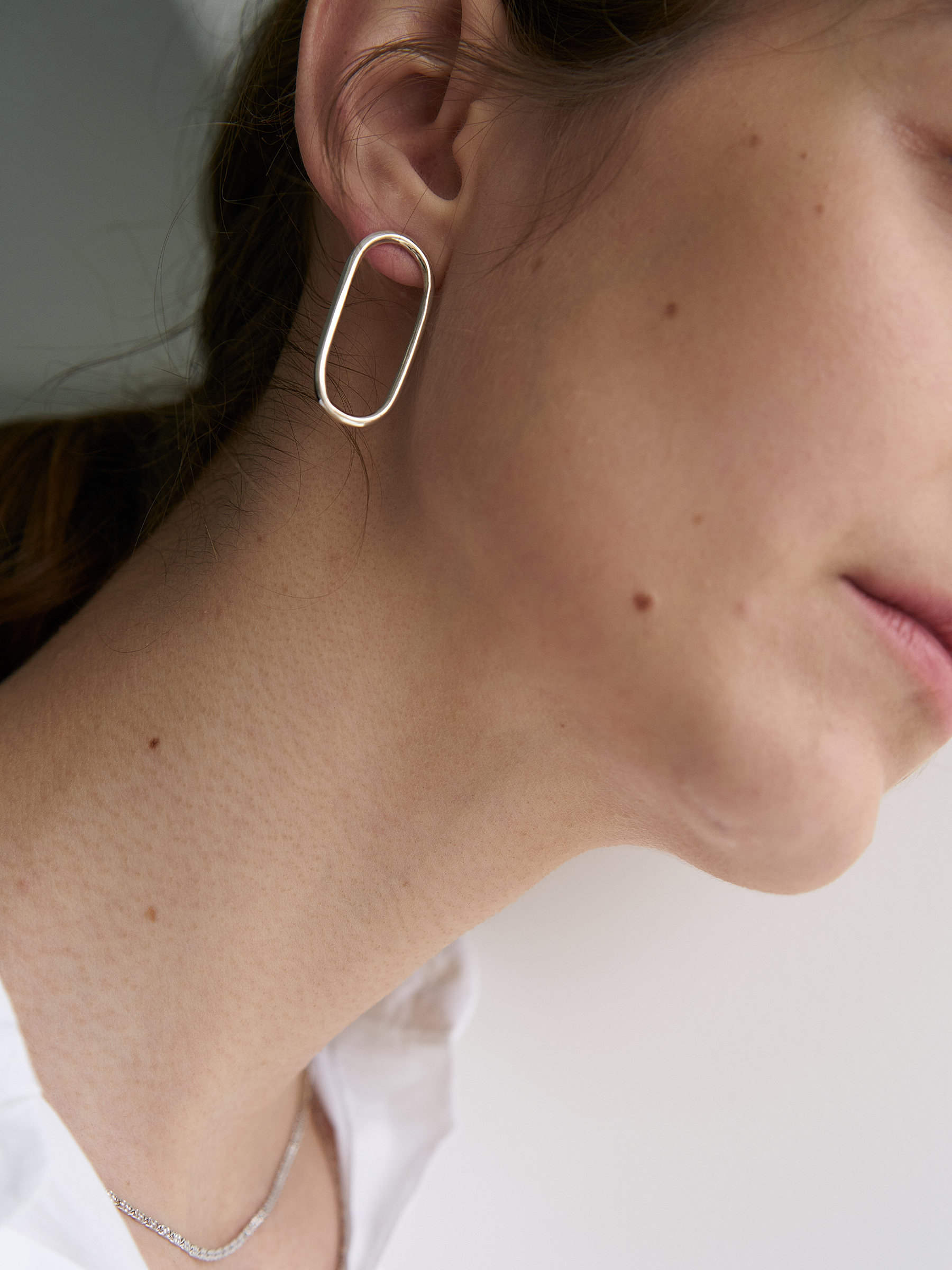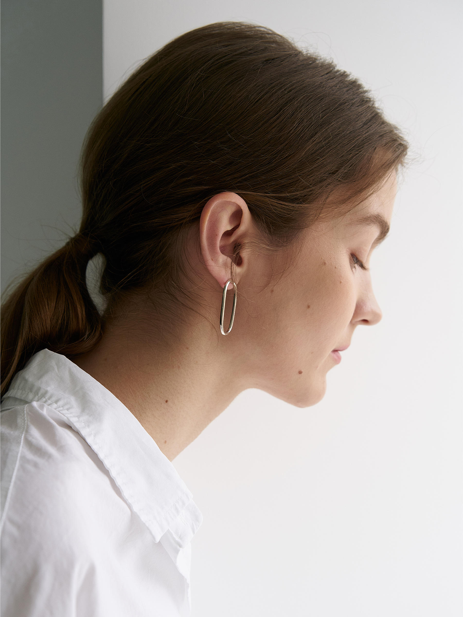 원형을 베이스로 한 모티브를 길게 확장해 균형감 있는 실루엣을 만들었으며, 심플한 스타일로도 룩을 깔끔하게 정리해주는 포인트가 됩니다.