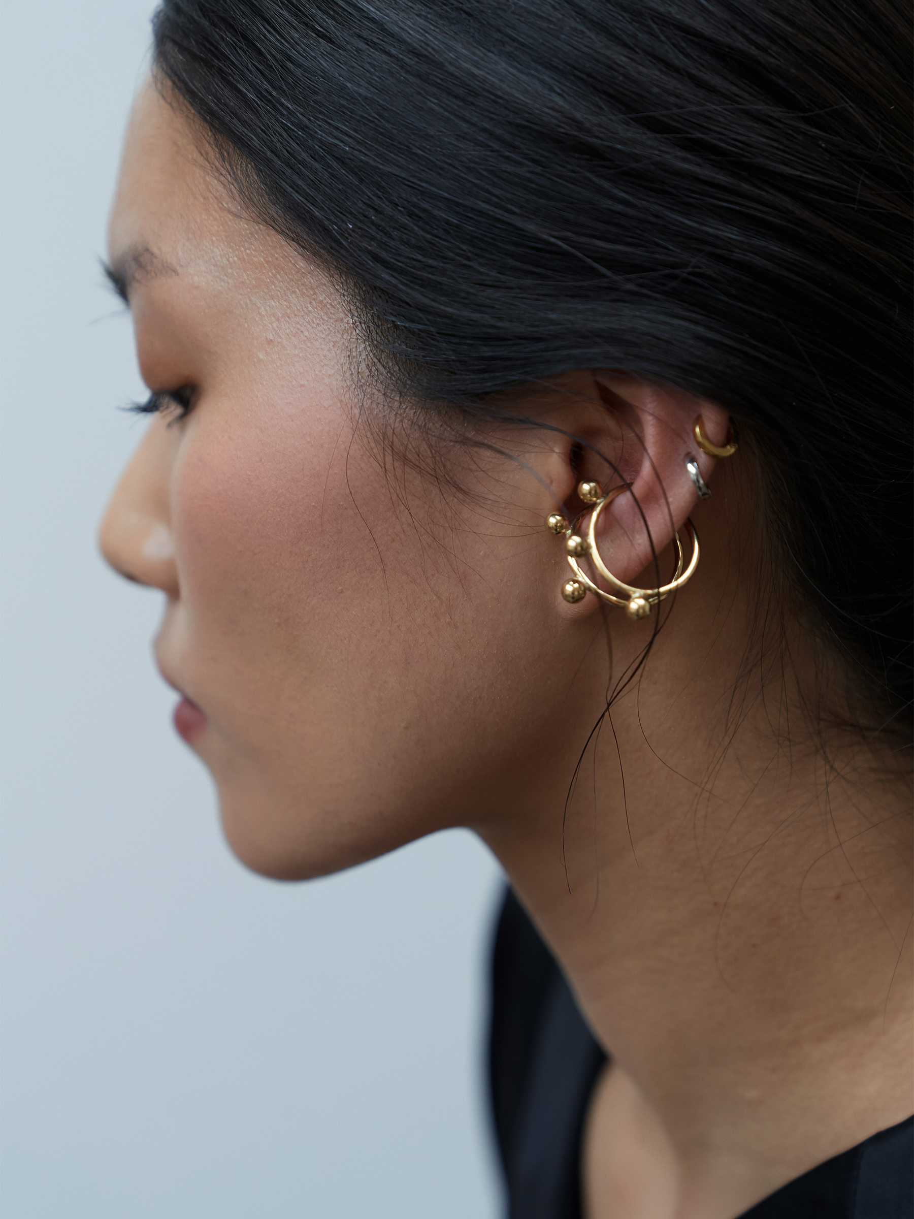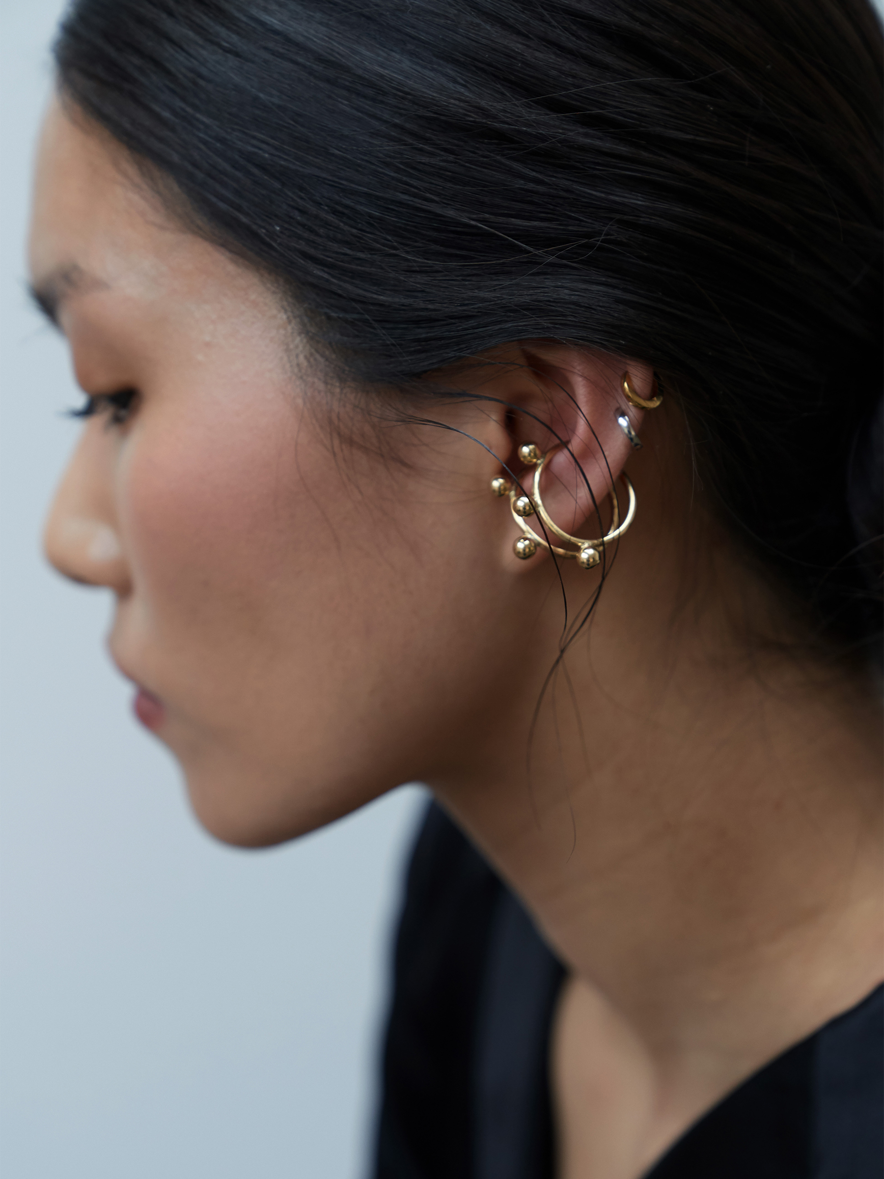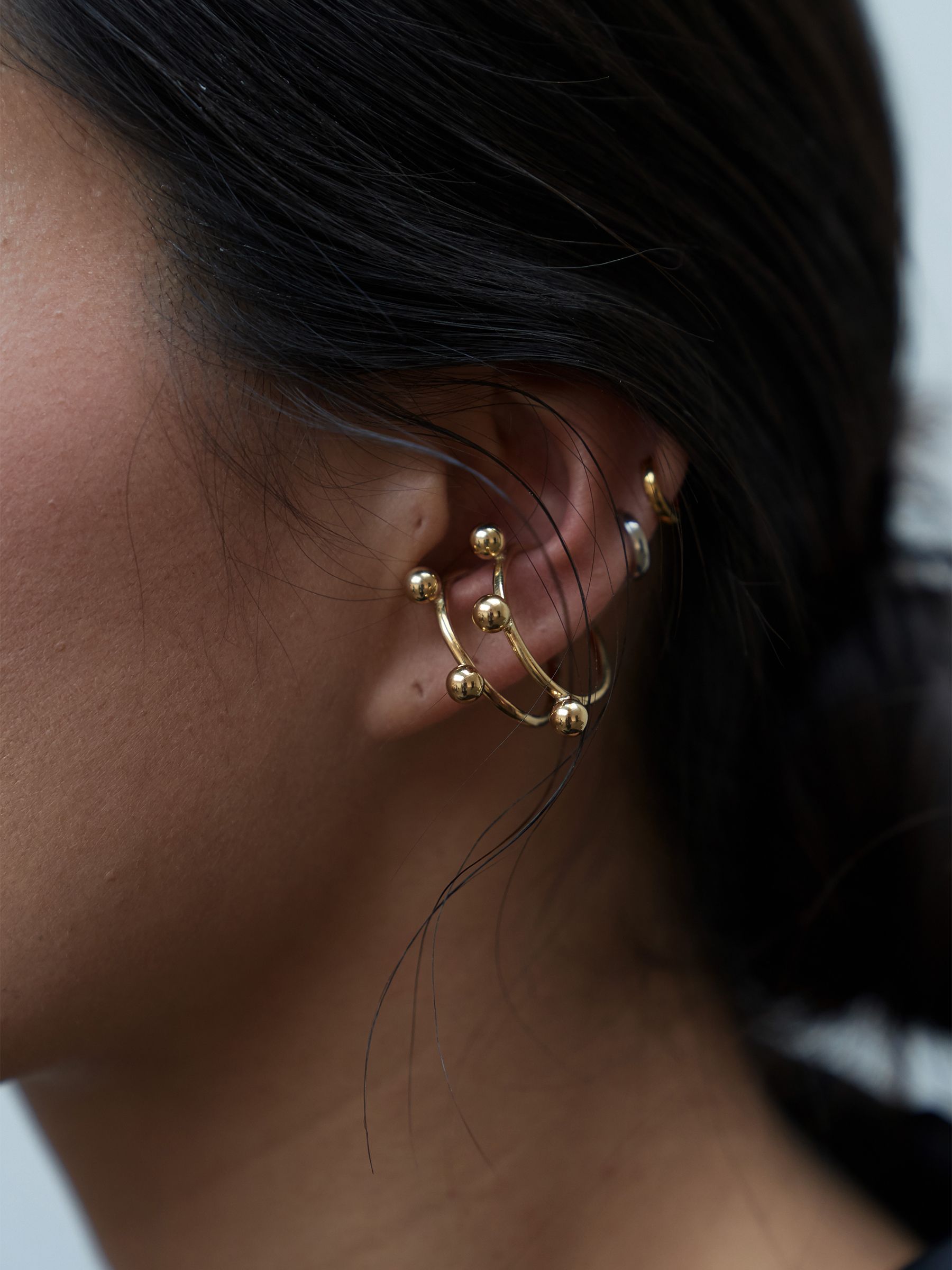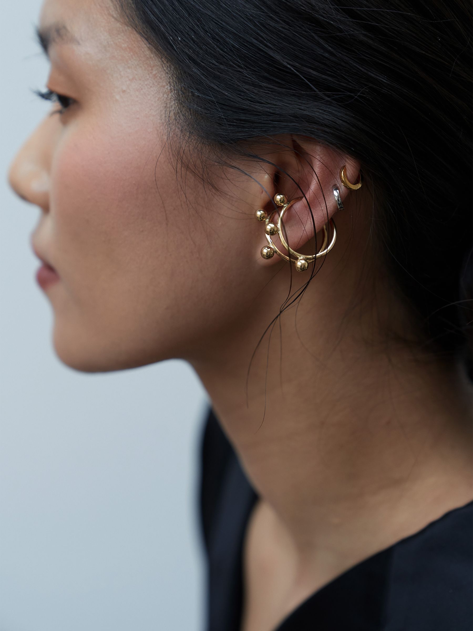 여러 개의 볼이 귀 라인을 따라 리듬감 있게 배치되어, 단독 착용만으로도 확실한 포인트가 됩니다.