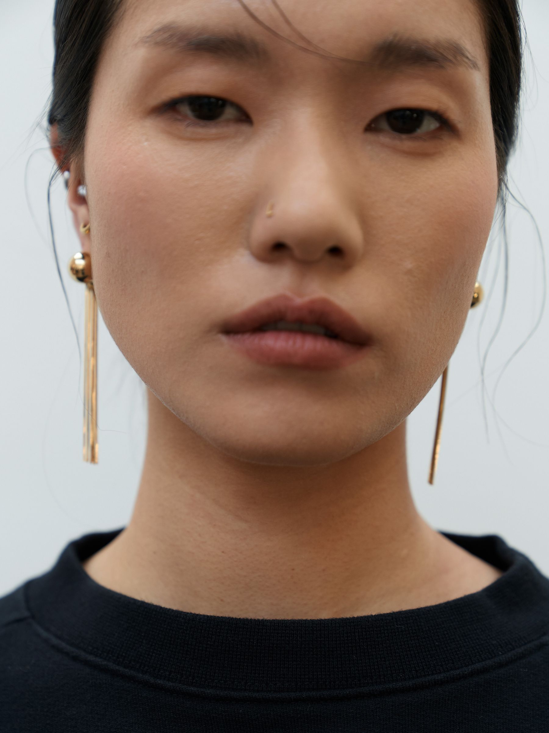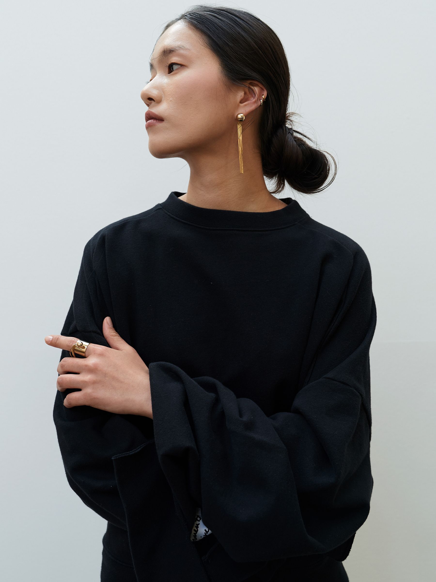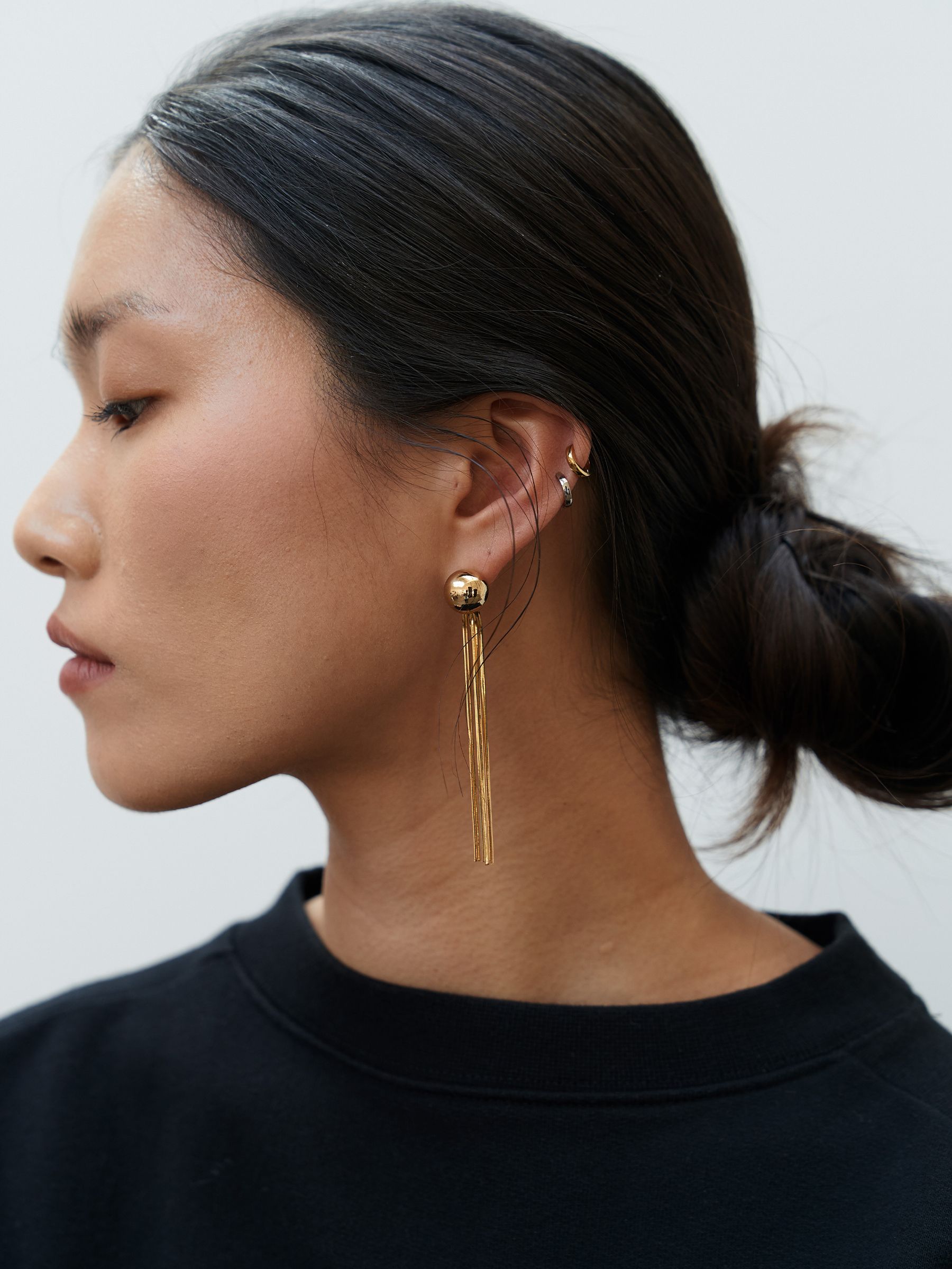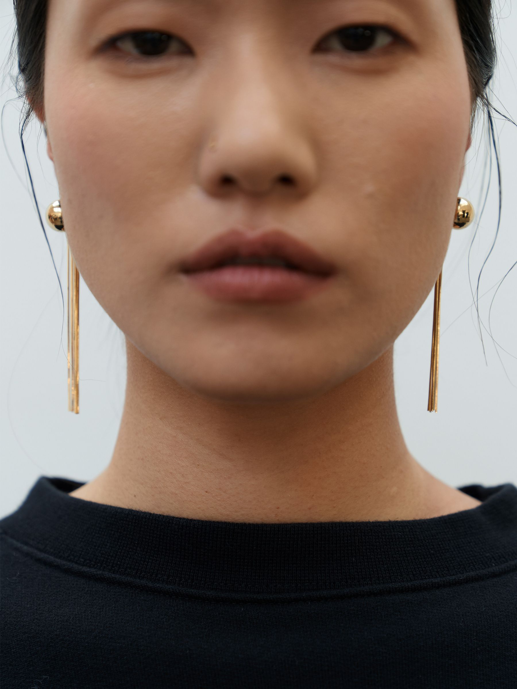 기본 BALL FRINGE EARRINGS보다 길이감이 더해져 얼굴선을 더욱 또렷하게 강조해주는 디자인입니다.