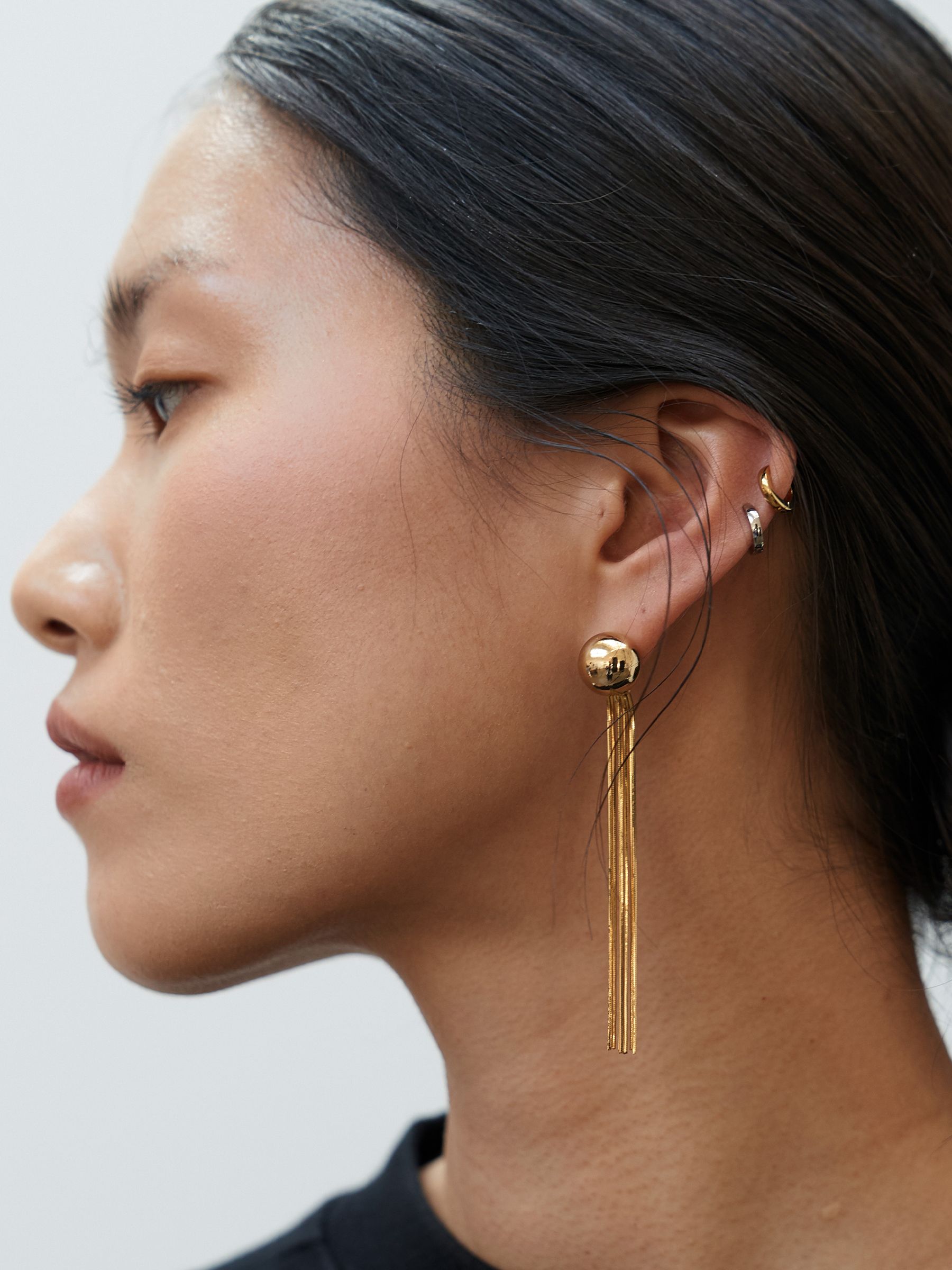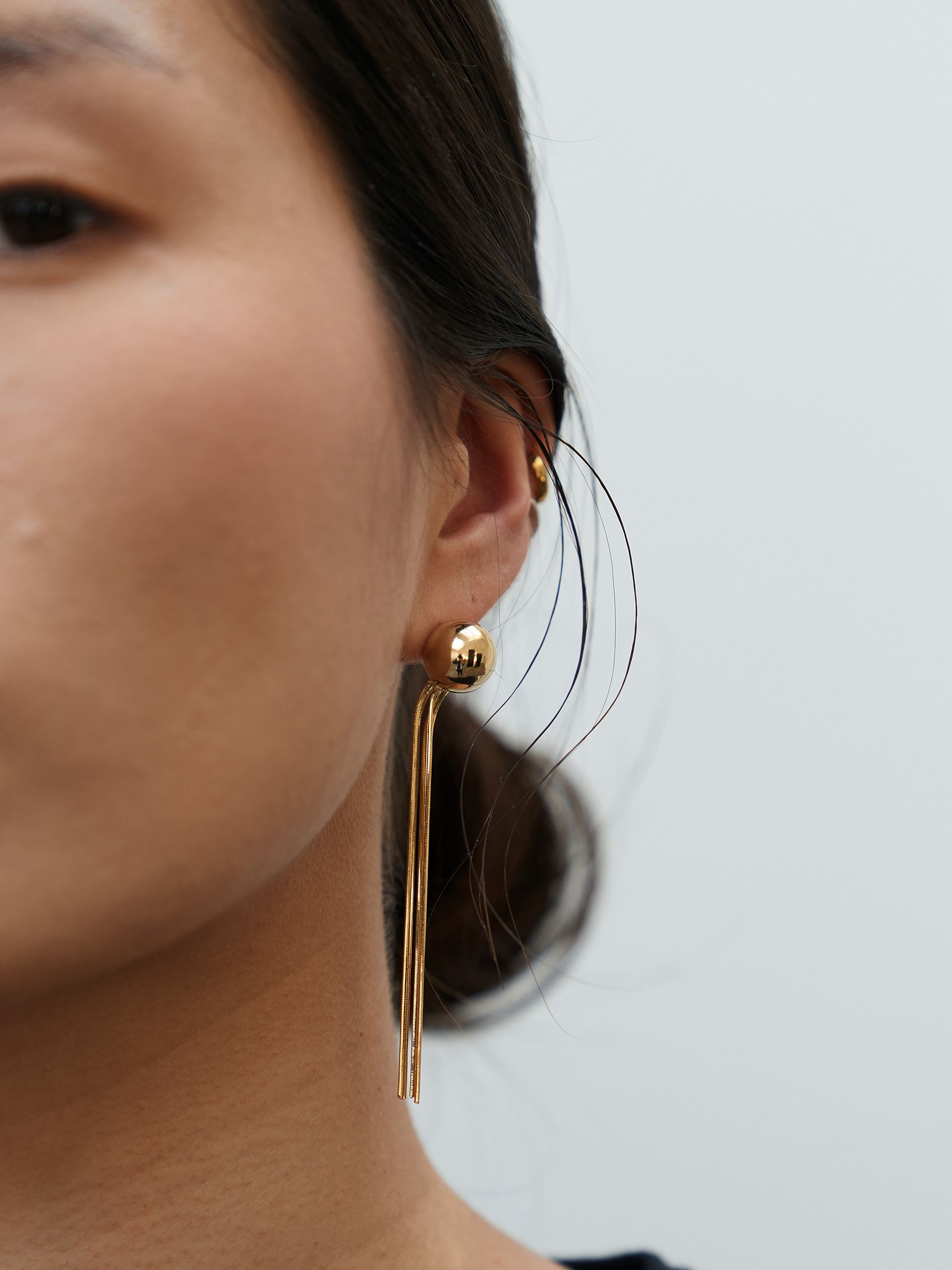 볼 장식에 여러 가닥의 체인을 연결한 드롭 이어링입니다.