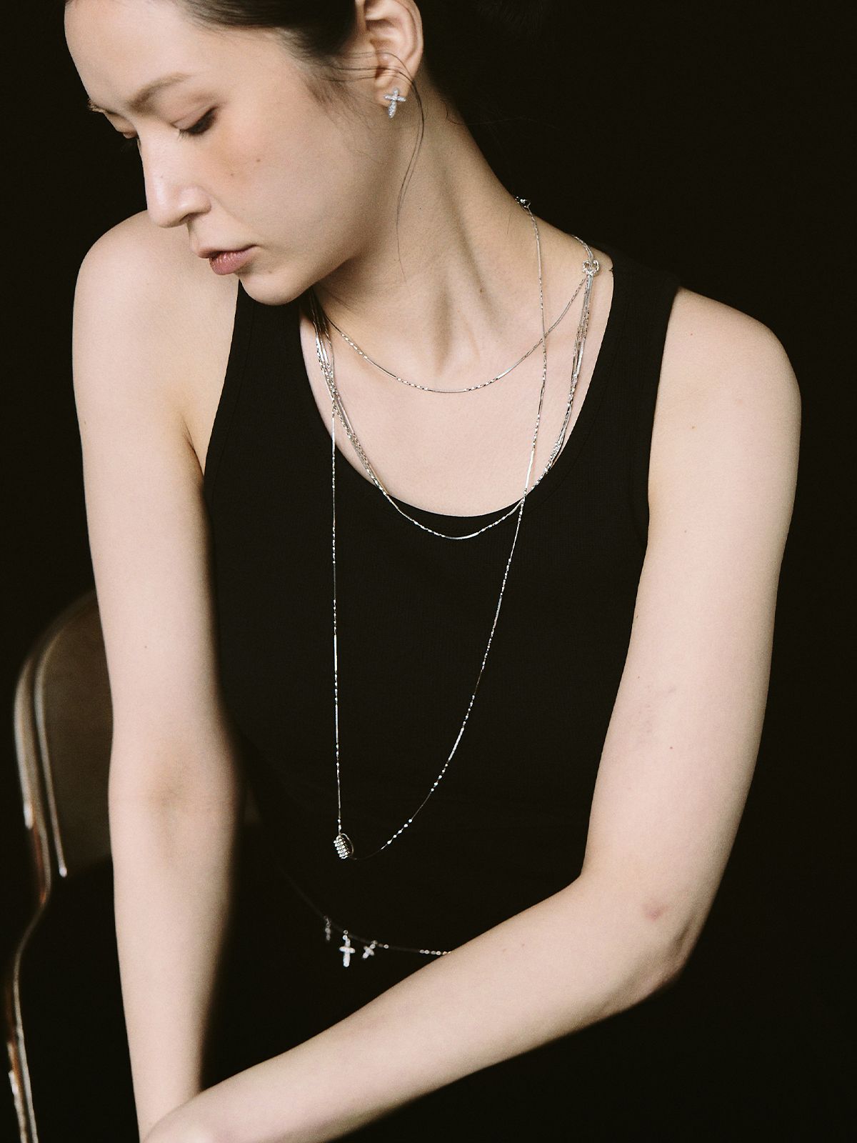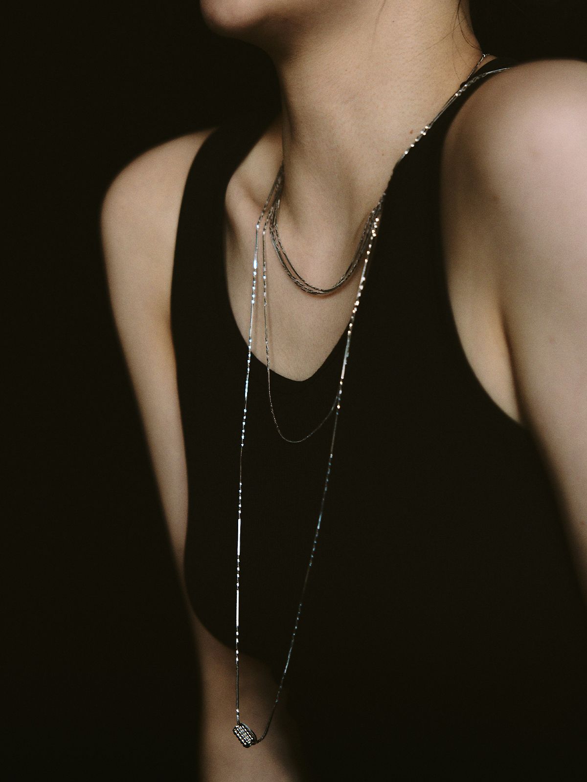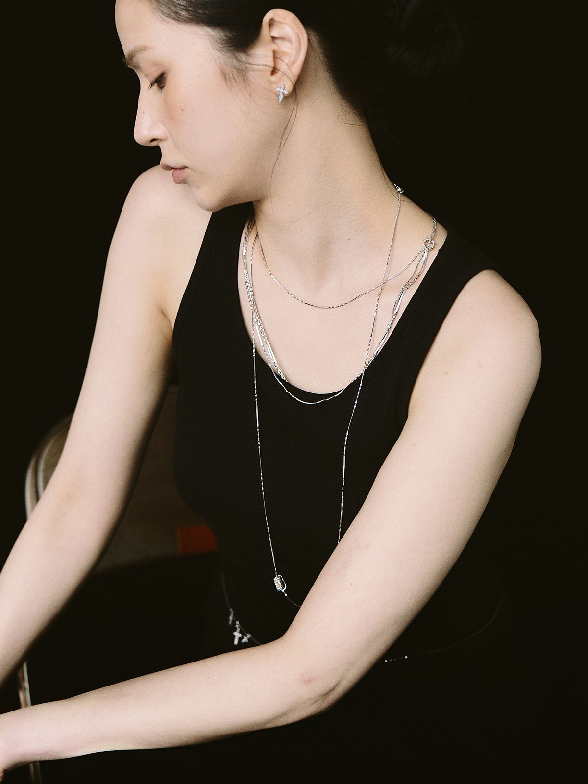 목선을 따라 얇은 체인이 여백을 남기고, 아래로 내려갈수록 시선이 자연스럽게 정리되며 실루엣이 길어 보이는 인상을 만듭니다.