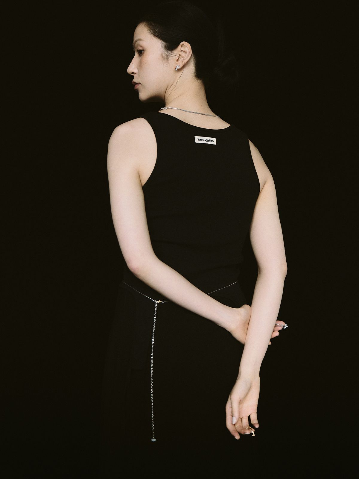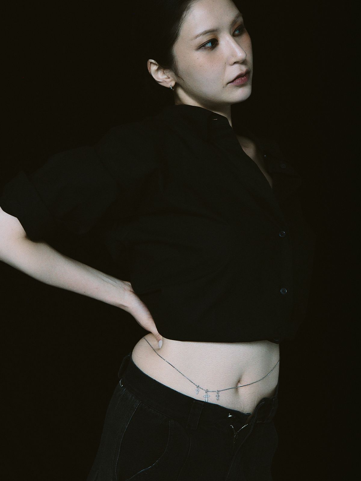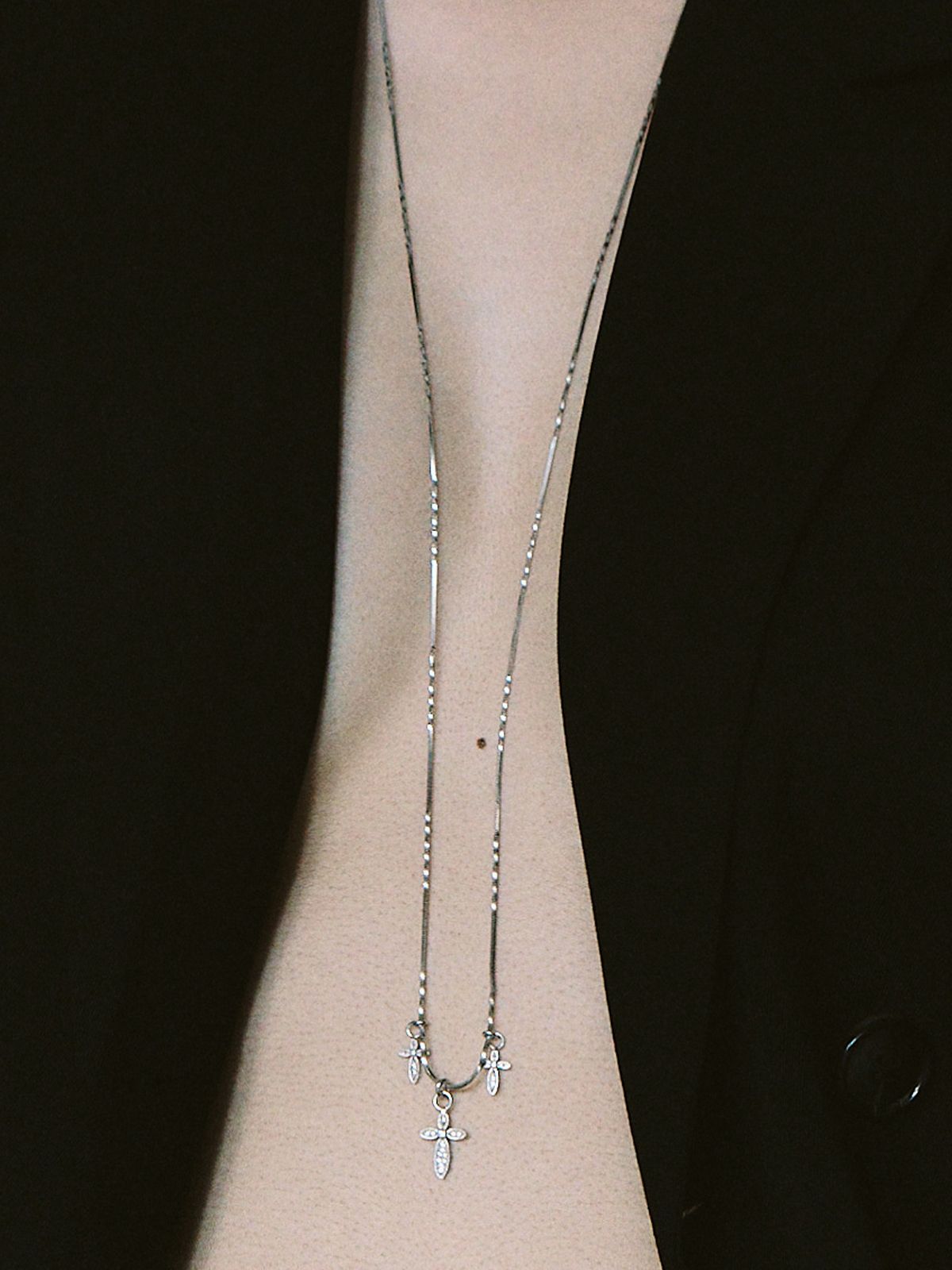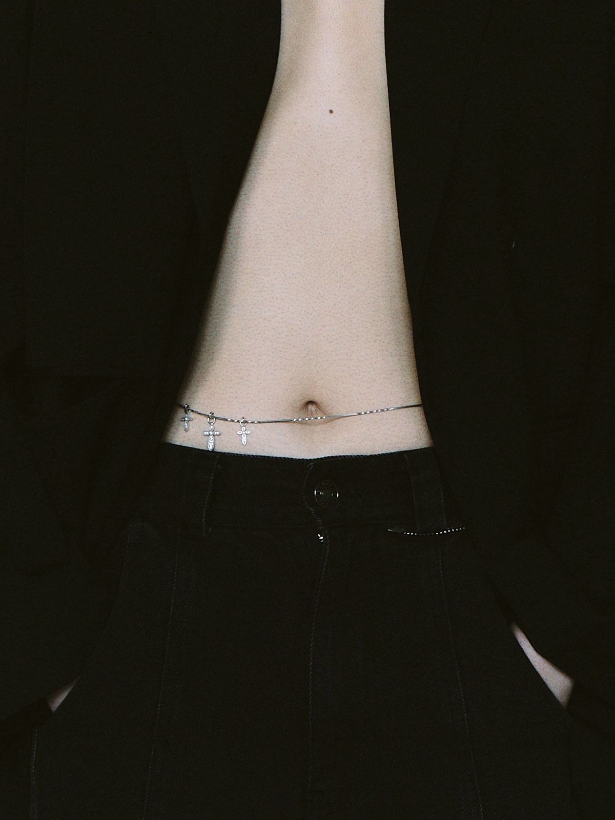 가느다란 체인 위로 작은 크로스 참을 촘촘히 더해, 허리선에 조용한 포인트를 남기는 웨이스트 체인입니다.