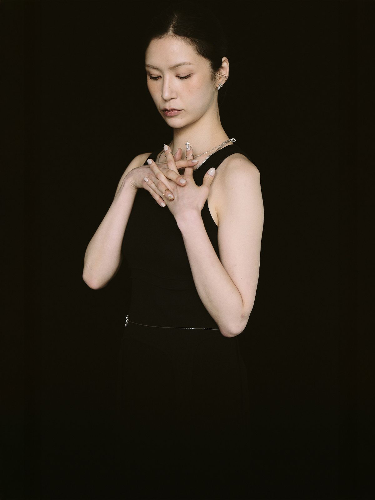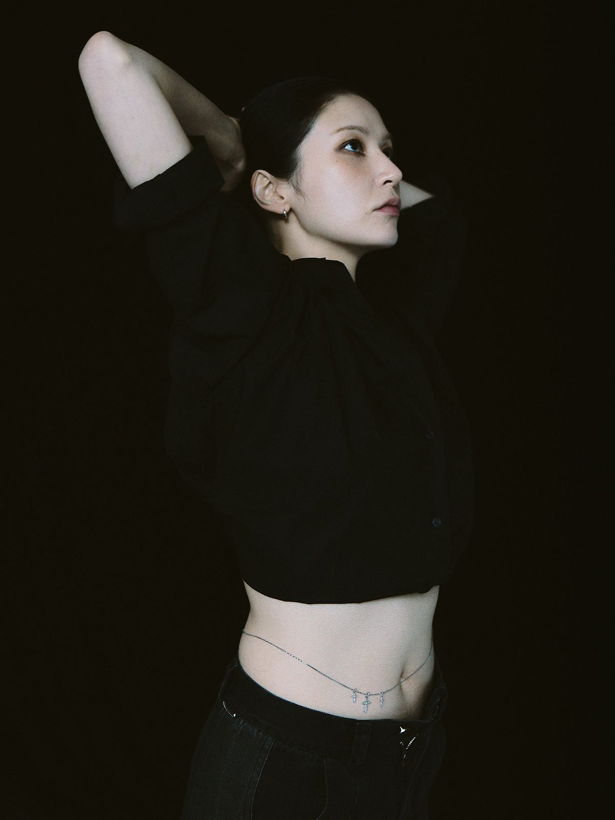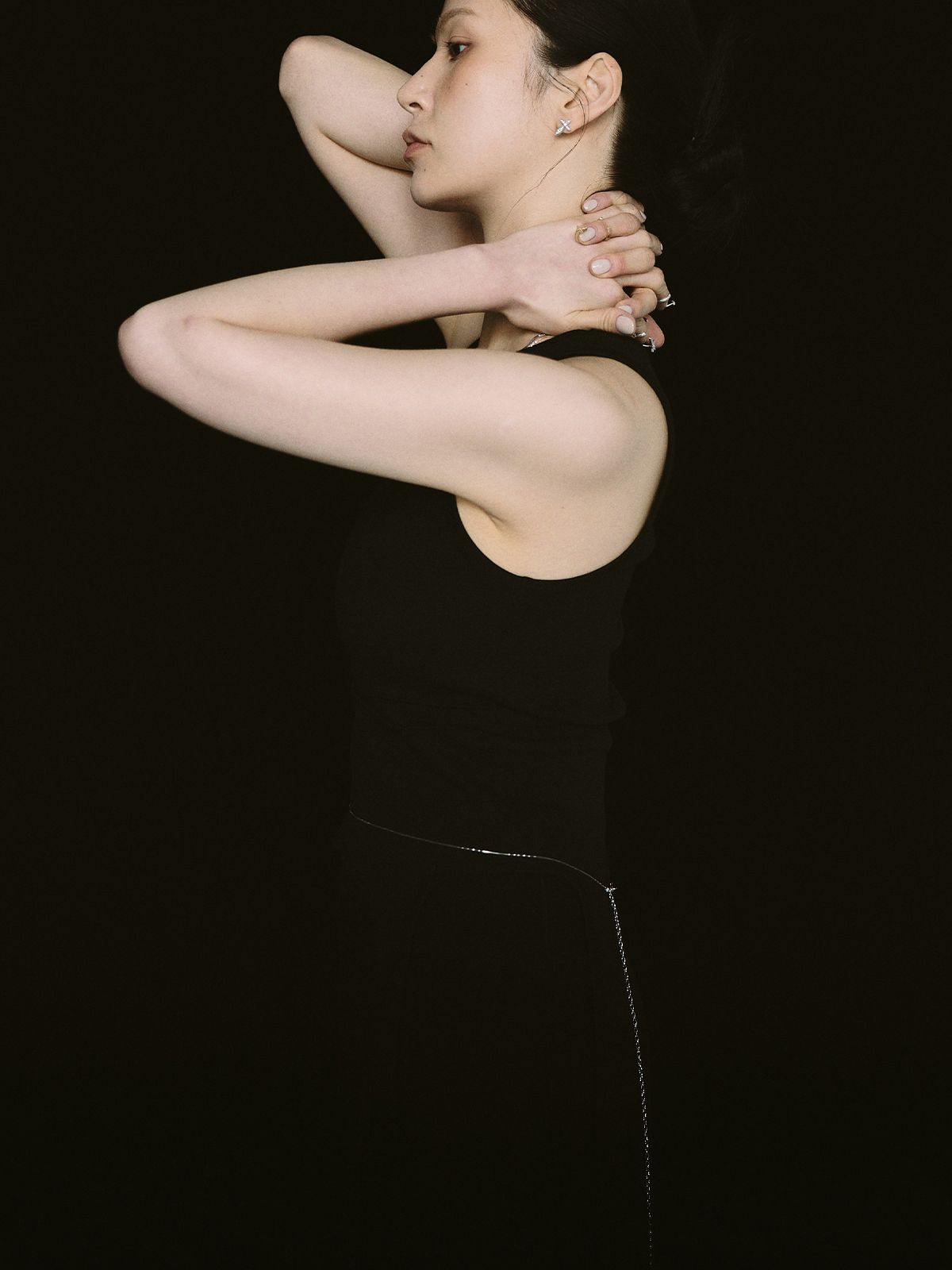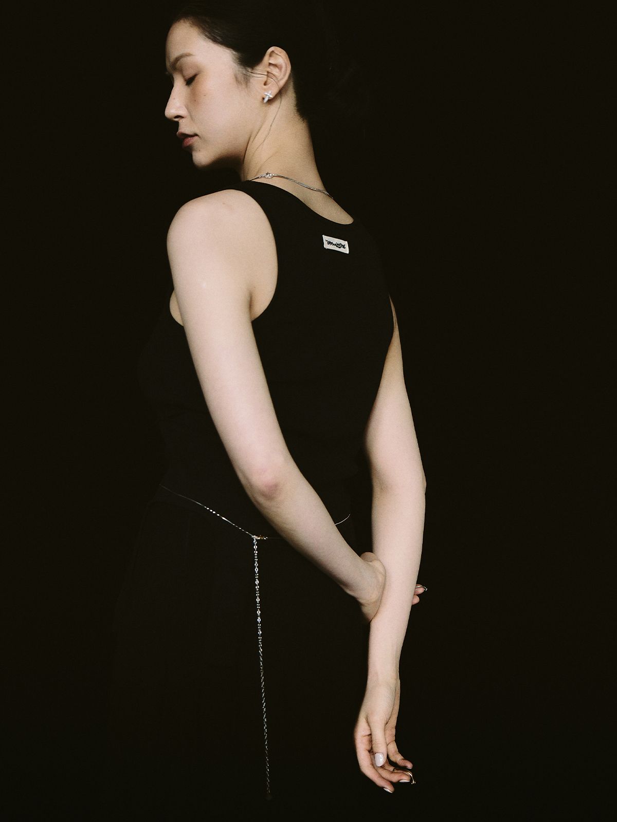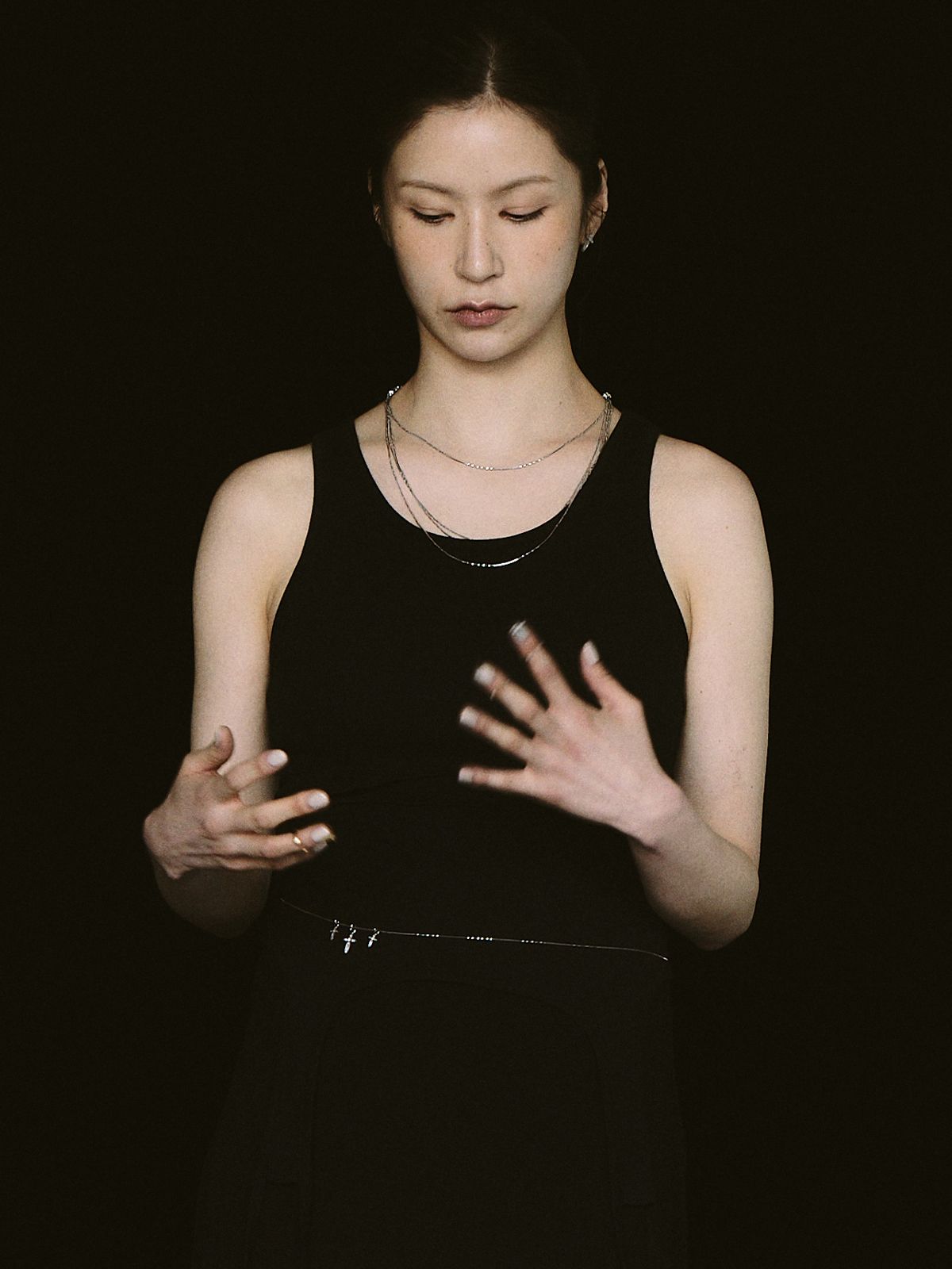 가느다란 체인 위로 작은 크로스 참을 촘촘히 더해, 허리선에 조용한 포인트를 남기는 웨이스트 체인입니다.