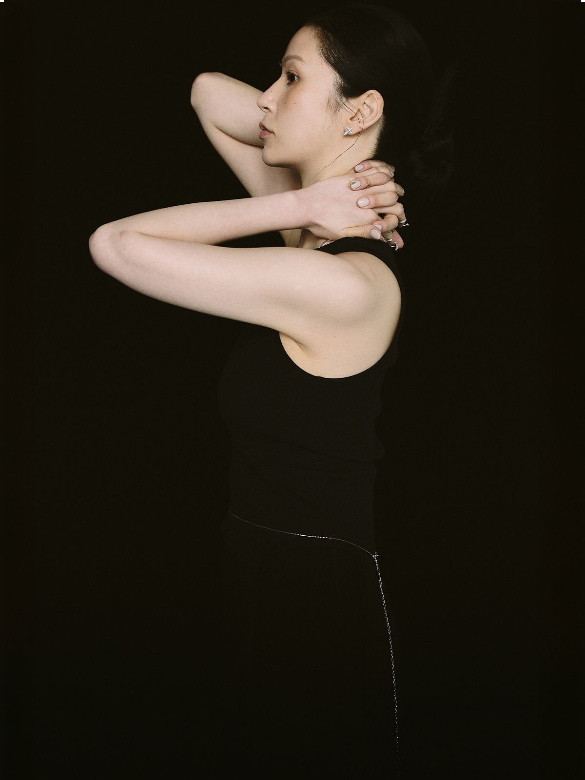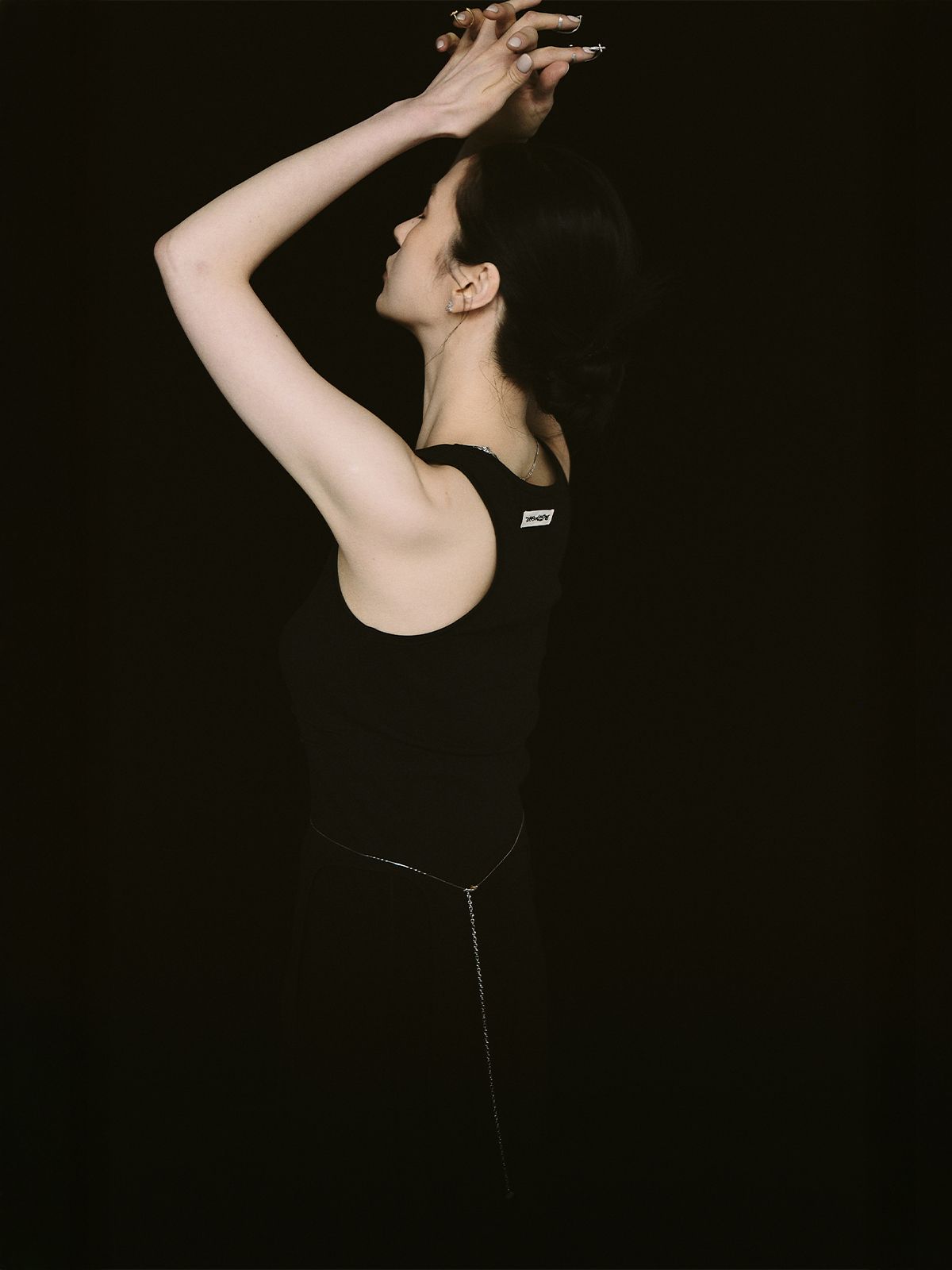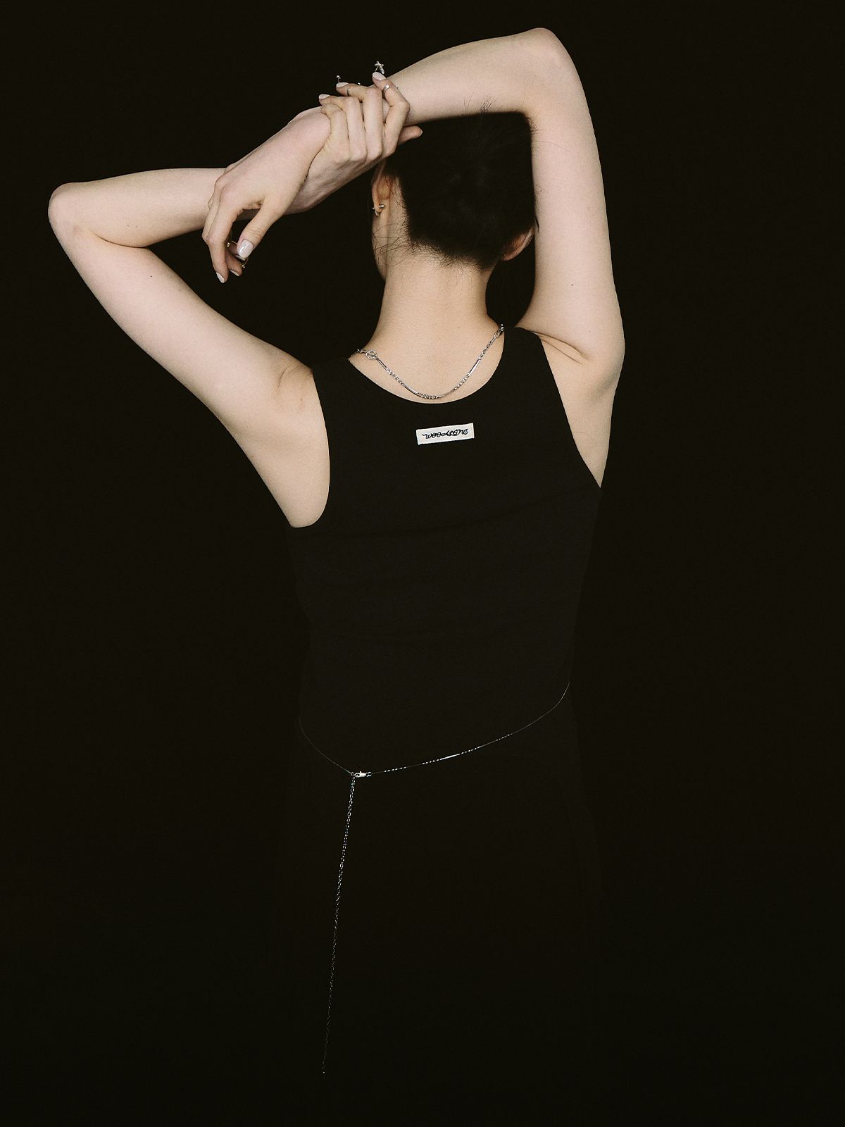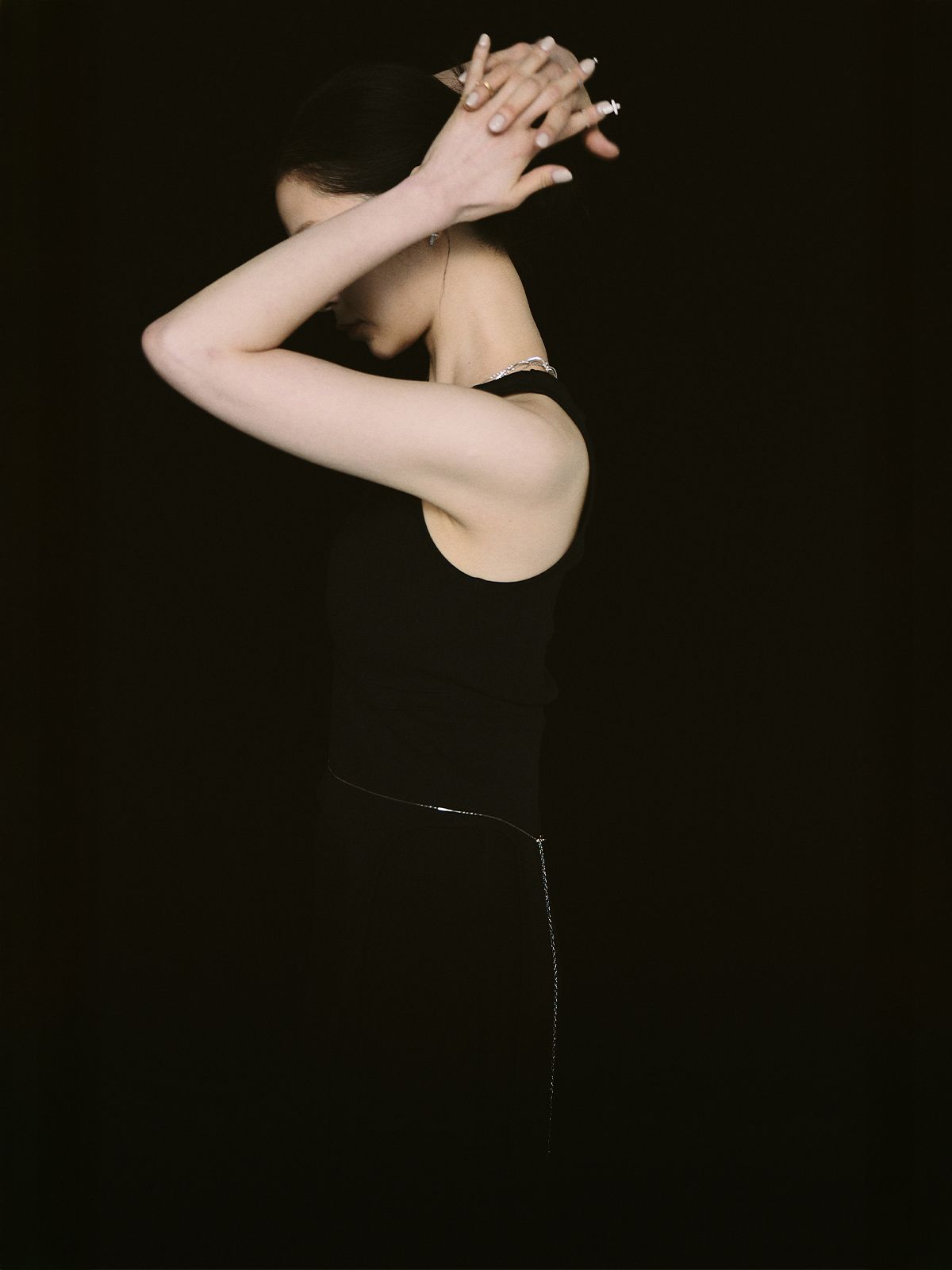 가느다란 체인 위로 작은 크로스 참을 촘촘히 더해, 허리선에 조용한 포인트를 남기는 웨이스트 체인입니다.